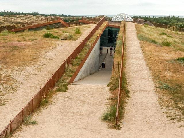 Vrijdag 2 juli 2021. We hebben problemen met de boordaccu. Hij is binnen een paar uur leeg. Als we de motor weer even laten lopen hebben we weer voor een paar uur stroom. Dat is eigenlijk niet te doen dus besluiten we zondag naar huis te gaan. We gaan zaterdag nog op familiebezoek aan de westkust, daarom rijden we vandaag vast 200 km naar het westen tot het Tirpitz museum in Blåvand. Het is een museum met een bunker, expositie over het opruimen van mijnen, over barnsteen en over 20.000 jaar aan de westkust met een 4D film. Het is een leuk museum waar we 3 uren doorbrengen.
