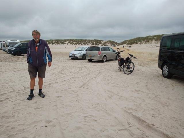 Zaterdag 3 juli 2021. We hebben 40 km gefietst. We hadden een mooie route gevonden naar een dorpje aan zee, maar omdat er een groot militair terrein tussen ons en dat dorpje lag, moesten we eromheen. We kwamen uit bij een groot autostrand. We hebben de fietsen er maar tussen geparkeerd. Na een strandwandeling van drie kwartier zijn we weer op de fiets gestapt en naar de camper terug gefietst.