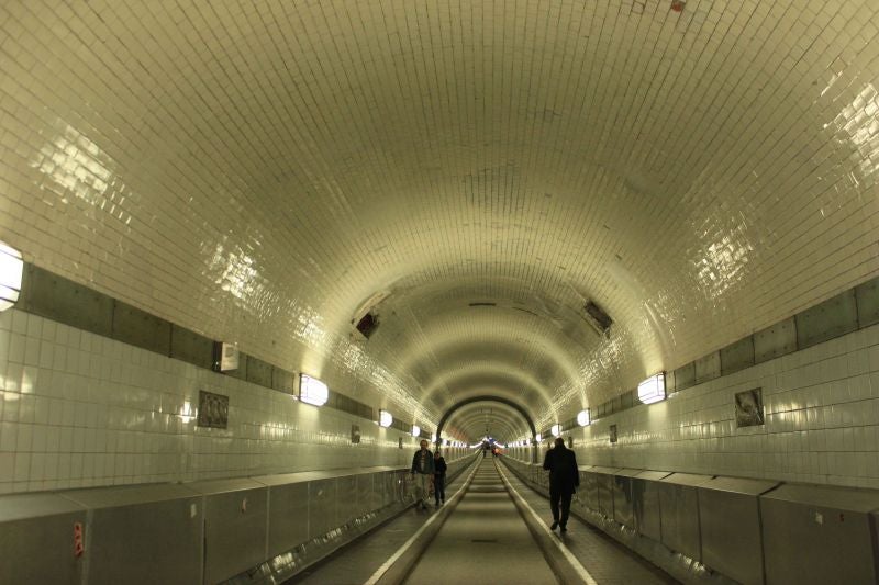 Dinsdag 5 november. We zijn 4 dagen naar Kopenhagen geweest voor een bezoek aan de kinderen en op de terugweg naar Hamburg gereden. We komen om 1 uur op de camperplaats aan. Een mooie plaats aan de Elbe. Nadat we gegeten hebben gaan we op stap. We staan vlak bij het centrum. Na 5 minuten komen we bij de Landungsbrücken, een ponton met restaurants en aanlegplaatsen voor rondvaart- en veerboten. Hier kijken we een tijdje rond en komen op een gegeven moment bij de oude Elbetunnel. Deze tunnel is in 1911 in gebruik genomen. Er gaan aan beide kanten 4 liften naar beneden. Er is één lift met een draagvermogen van 10.000 ton of 130 personen, de andere liften zijn kleiner, hier mag 6.000 ton in. In de grote lift kunnen 2 auto's. In de tunnel is een smalle autoweg waar op bepaalde tijden de auto's één kant op kunnen rijden en later op de dag weer terug. Verder zijn er nog 2 trottoirs. De tunnel is mooi betegeld. Een leuke ervaring.