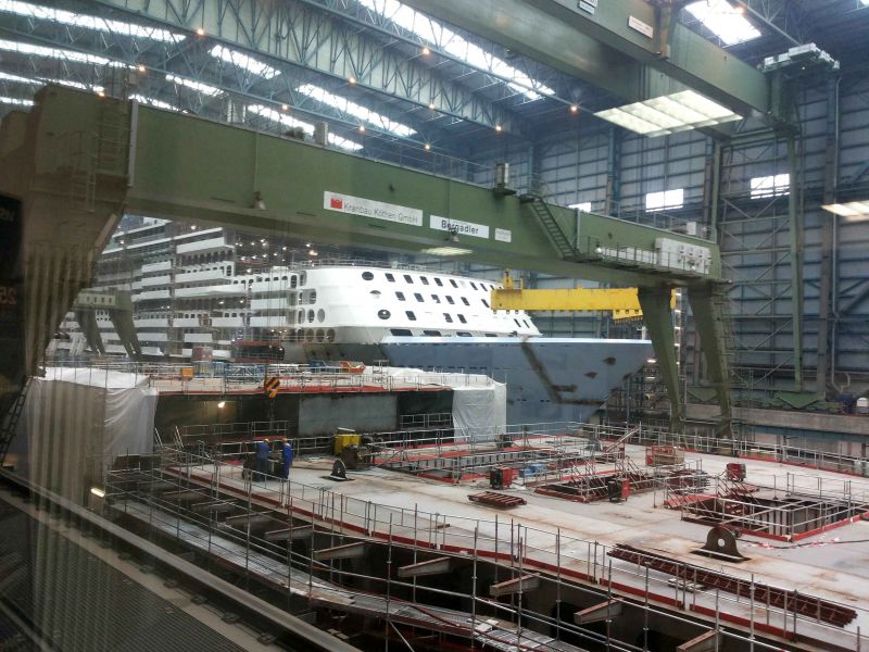 De bus vertrok om 2 uur. We hebben het bezoekerscentrum bekeken en de 2 grote hallen waar de schepen als een soort bouwpakket in elkaar gezet worden. Men bouwt hier enorm grote cruse schepen, de grootste ter wereld die nog net door het Panamakanaal kunnen. De schepen worden in vier delen gebouwd, met de zijkanten open. Hier worden de hutten in geschoven en daarna wordt de zijkant dicht gemaakt. Een groot cruseschip wordt compleet met alles er op en aan in 18 maanden gebouwd.
