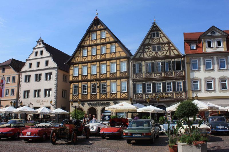 Verder naar Bad Mergentheim met een mooi slot en een oud centrum met vakwerkhuizen. Er was net een oldtimer autoclub gearriveerd. Alle oude auto's staan in het centrum geparkeerd. We hebben ze allemaal bekeken. Ze pasten mooi in het straatbeeld.