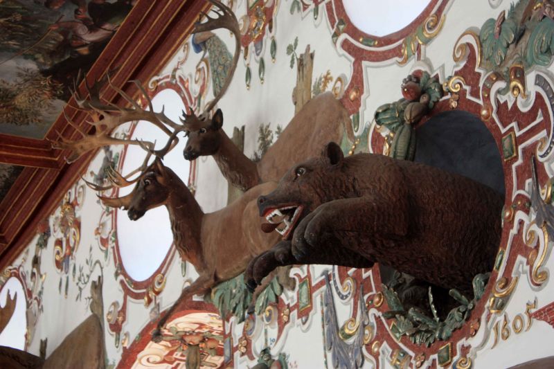Hierna naar Weikersheim met zijn prachtige Renaissanceslot. We hebben hier een rondleiding gehad. Vooral de jachtzaal waar de beren en herten “uit de muur" komen is erg mooi.