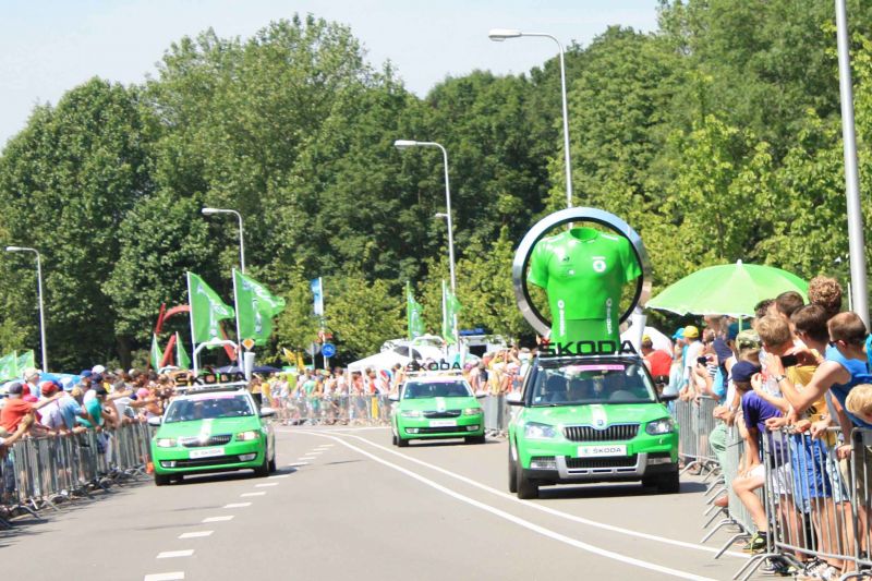 Zaterdag 4 juli. De verwachting is dat het vandaag 34 graden wordt. We zijn om 11 uur naar het parcours gefietst en konden een plekje onder het viaduct bemachtigen, mooi in de schaduw en met een rand om op te zitten. Het was wel wachten. Af en toe kwam er een renner aan om het parcours te verkennen. Om half 1 kwam de de reclamekaravaan langs. Allemaal auto's met grote reclame beesten en zo er bovenop. Er werd van alles naar het publiek gegooid, petjes, dropjes, sleutelhangers en nog veel meer. Deze karavaan was na een kwartier voorbij. Om 2 uur kwamen de renners voor de tijdrit. Ze startten om de minuut, eerst kwamen 2 motoragenten, dan de renner, dan een motor met een cameraman en dan een tourwagen met een reservefiets. Wel leuk om het eens mee maken, maar ook een heel lange zit.