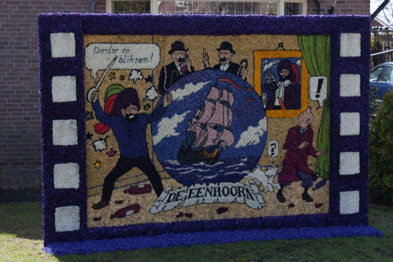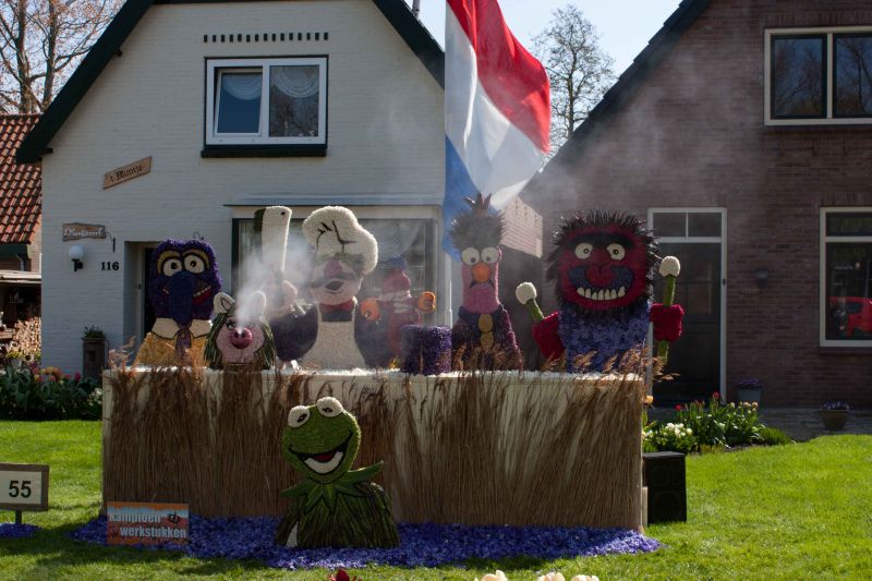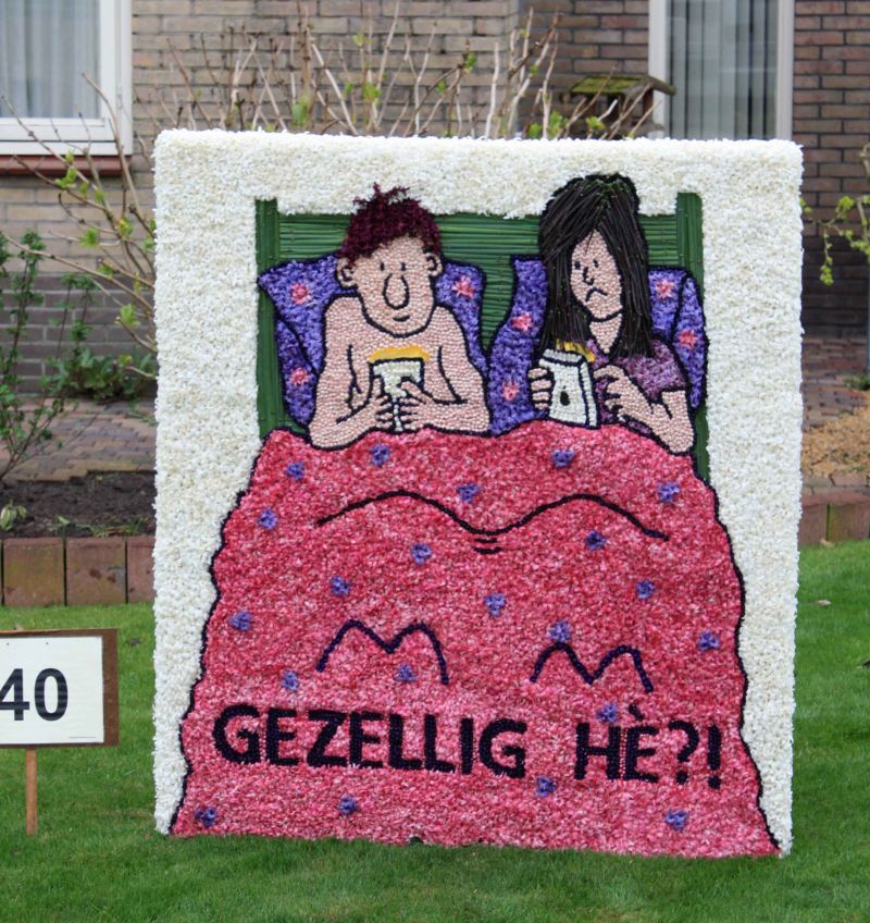 De bedoeling was dat we in Breezand op de fiets de mozaïeken zouden gaan bekijken maar omdat het erg regende en heel had waaide zijn we met de campers in colonne langs de mozaïeken gereden. De inwoners van Breezand hadden met de bloempjes van de hyacinten hele mooie mozaïeken gemaakt. Prachtig om te zien.