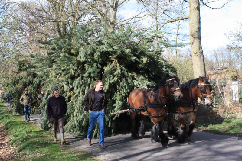 Zaterdag 7 april. In Ootmarsum vertrekken om 13 uur 3 karren met paarden ervoor vanaf het marktplein naar het Springendal om “Poashout” te halen voor het paasvuur. Er gaan veel mannen en jongens mee om te helpen. Een mooi gezicht, die paarden. Wij zijn naar het openluchtmuseum in Ootmarsum geweest. Interessant museum met een goede audiotour. Het was erg koud. Om weer wat op te warmen hebben we een eind gefietst naar het Springendal. Onderweg kwamen we de wagens met “Paashout” tegen. De mannen hadden erg hun best gedaan.