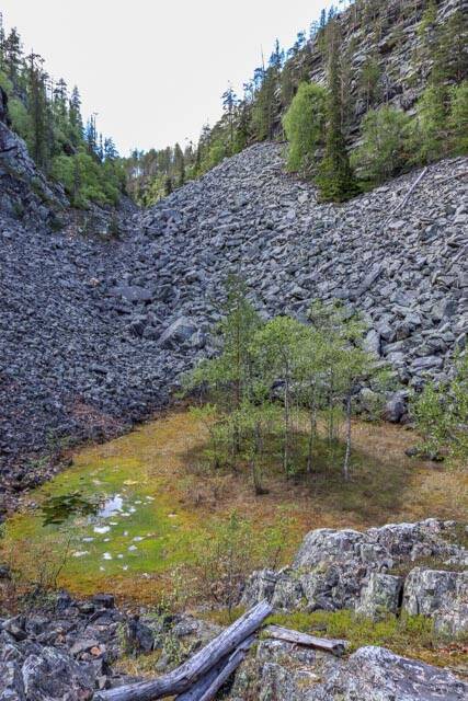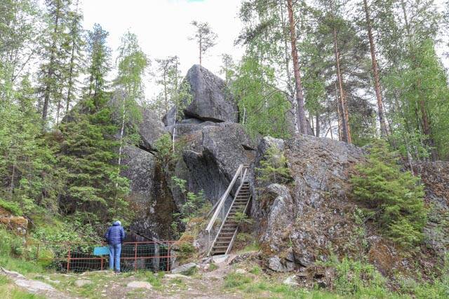 Donderdag 13 juni 2019. We hebben vandaag een flink stuk gereden, ongeveer 250 km. We zijn naar Karhunpesäkivi geweest, vertaald: berennest. Dit is weer zo'n diepe, komvormige holte, alleen is een stuk van de rots afgebroken door de gletsjer en meegenomen tot boven op een heuvel en op de kop neergelegd. Je moet voor een gat in de holte kruipen.