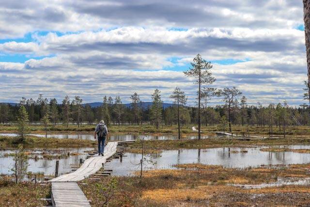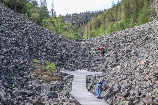 Hierna zijn we naar het Naava bezoekerscentrum gegaan, gister lazen we in een krantje dat je hier wandelingen kunt maken. We hebben 2 wandelingen gecombineerd, één door een moeras over vlonders en één door een kloof die vol ligt met dikke blokken steen. De helling is 50 meter hoog. Een erg mooie tocht van 14 km. We zijn 4 uren onderweg geweest.
