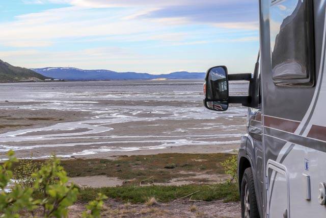 We staan nu aan het fjord, vlak bij Lakselv, 250 km vanaf Mehamn. Coördinaten N 70.08260 E24.9163 gratis, geen voorzieningen. Wel een mooi uitzicht. Het waait bij vlagen erg hard. Dan schudden we helemaal. Hopelijk gaat de wind snel liggen.