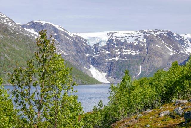 We zijn naar de Øksfjordjøkelen gereden. De enige gletsjer in Noorwegen waar de gletsjertong in zee komt. We hebben hem vanaf een afstandje bekeken. Er helemaal naar toe is 8 km over stenen. Dat vonden we te ver. Zo kun je hem ook mooi bekijken.