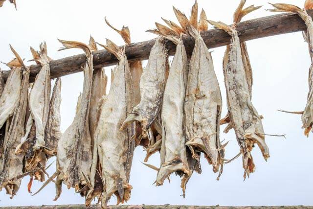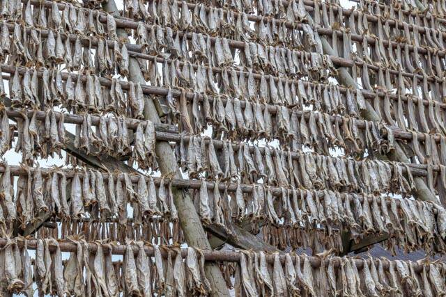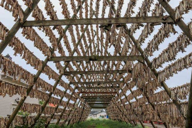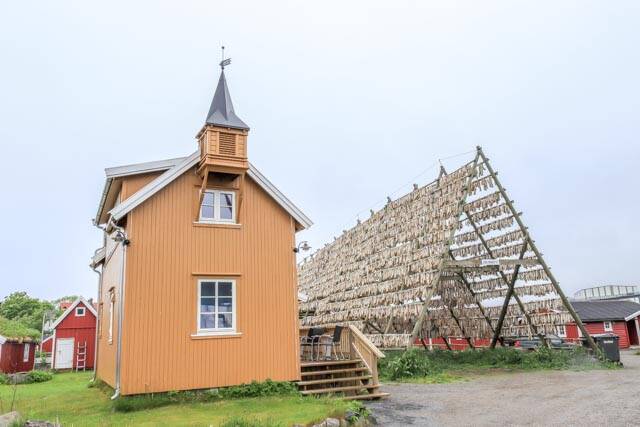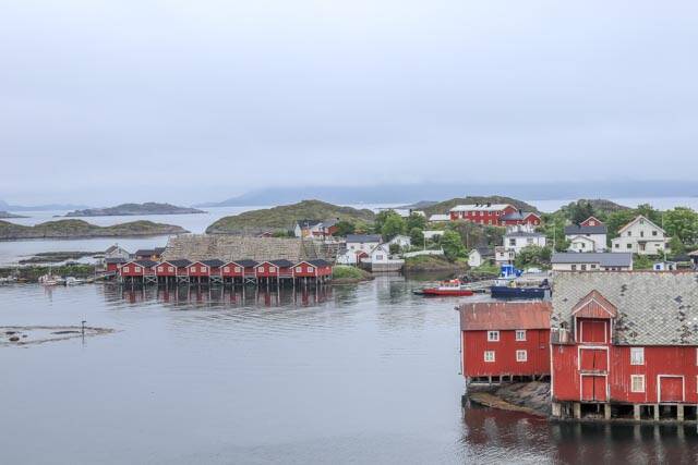 We zijn naar Svolvær gereden. We hebben hier geparkeerd en zijn door het stadje gelopen. Op een gegeven moment zagen we dat er een excursie aangeboden werd naar Svinøya, een wijk van Svolvær, 800 meter lopen. We zijn hier zelf naar toe gegaan. Het is een oud vissersdorpje. Leuk om er rond te lopen. Er staan veel oude vissershuisjes en een rek met stokvis.