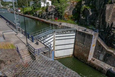 Hierna hebben we de kerk bekeken en zijn doorgelopen naar het sluizencomplexen in het Trollhättenkanaal. Dit kanaal loopt van oost naar west Zweden. Er moet hier een hoogteverschil van 40 meter overbrugd worden. Er was een heel oud sluizencomplex uit 1800, niet meer in gebruik van 6 trappen. Een nieuwer sluizencomplex met 4 trappen ook buiten gebruik en een veel gotere met 3 trappen. Mooi om te zien.