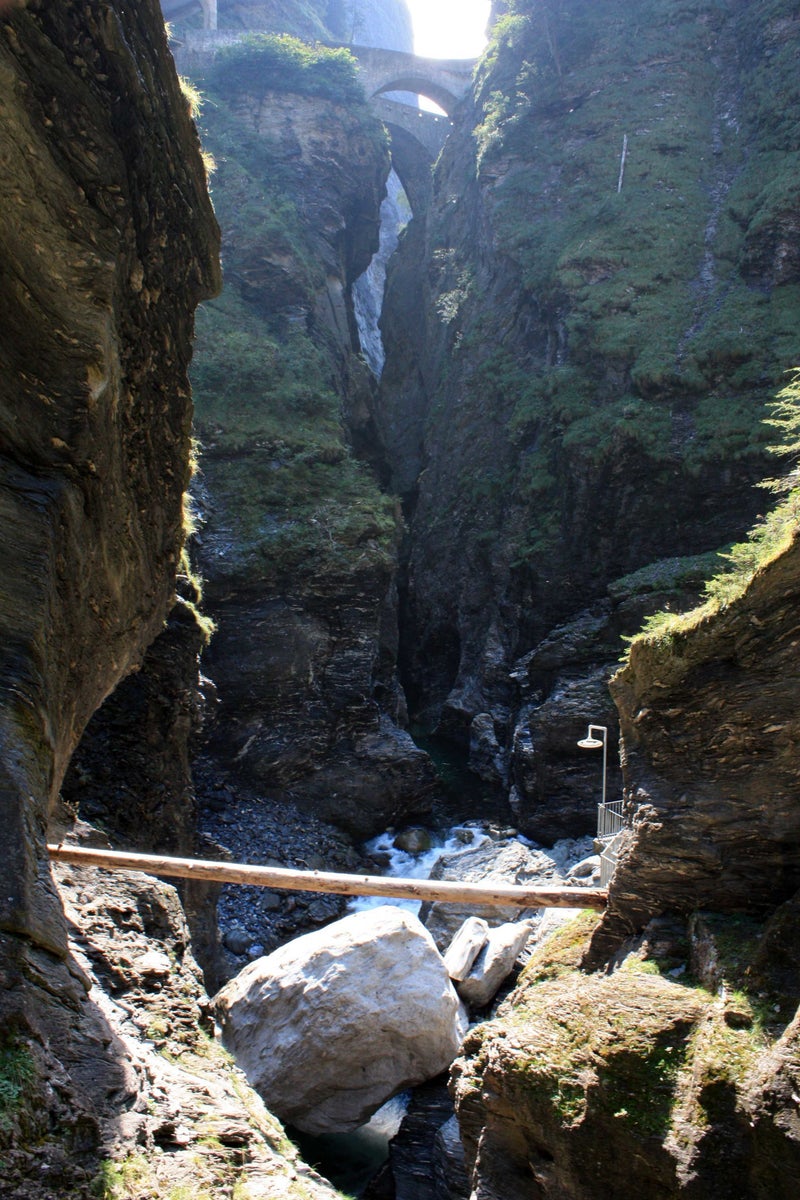 Zaterdag 10 september. We zijn naar de Viamala Schlucht gereden, een erg nauwe doorgang van de Hinterrhein. De rotswanden zijn hier 300 meter hoog en maar een paar meter breed. Er is een kiosk waar je een kaartje moet kopen en dan kan je 321 treden naar beneden lopen tot onder in de kloof. Het is hier erg indrukwekkend. Zeker de moeite waard.